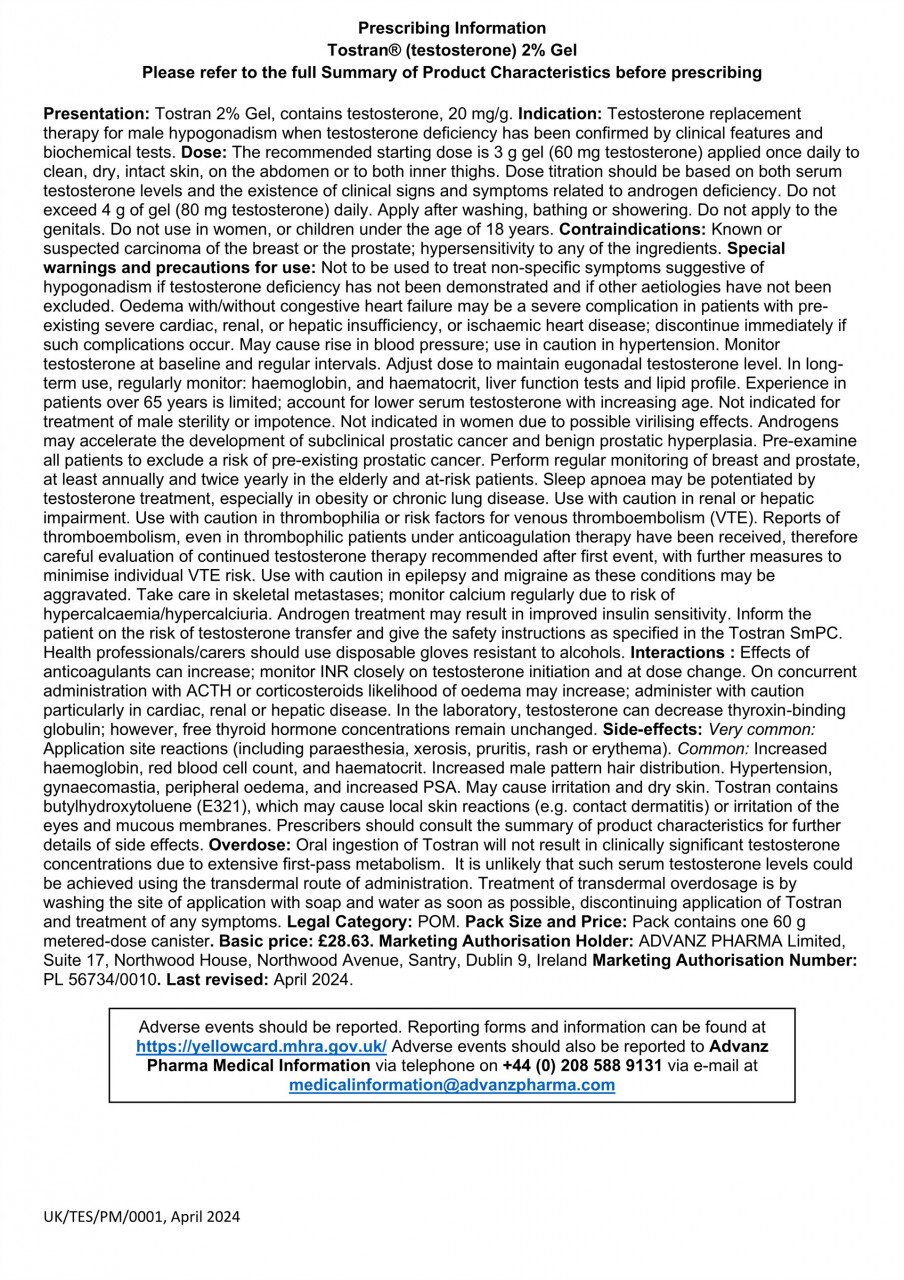 Tostran® (testosterone) 20mg/g transdermal gel